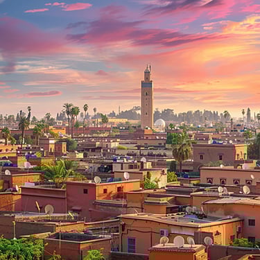 • MARRAKESH: Piazza Jemaa El Fnaa - Medina - Moschea Koutoubia - Museo Dar Si Said - Palazzo El Bahia - Palazzo El Badi - Tombe dei Saadiani - Museo Archeologico - Giardini Majorelle - Chichaoua - Deserto di Agafay - Lago Lalla Takerkoust - Imlil - Valle dell'Ourika - Passo Tizi n'Tichka - Ait Ben Haddou - Ouarzazate - Cascate di Ouzoud - Tinghir - Al Rashidiyya.